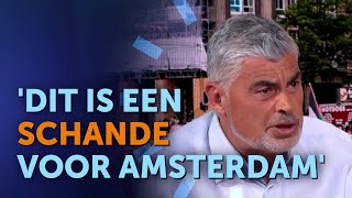 Een pro-Palestijnse demonstrant spoot zaterdag de leus ‘Never again is now’ op het Nationaal Monument in Amsterdam. Verslaggever Pim Markering spreekt met ondernemers die de agressie van betogers zat zijn. Voor bewoners en winkeliers rond de Dam is de maat vol: zij eisen een einde aan de protesten in de binnenstad.